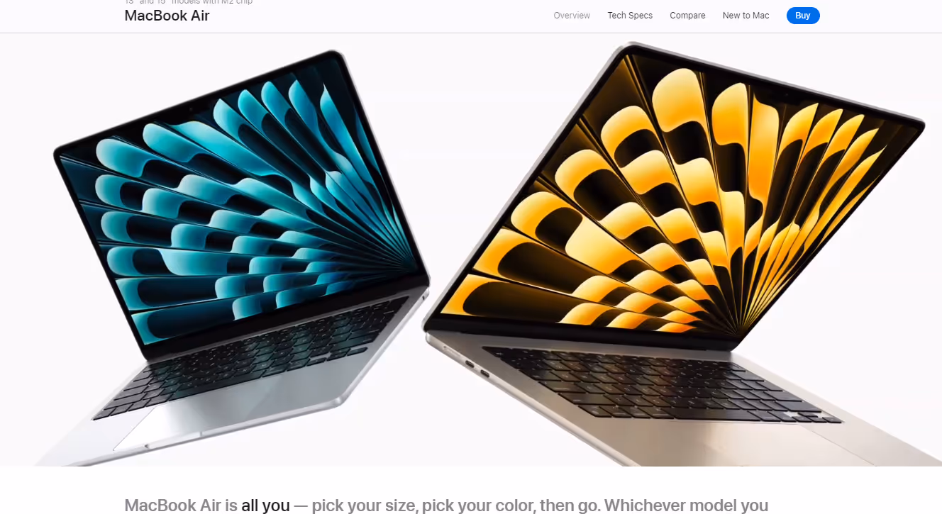 Apple's MacBook Air page combines high-resolution imagery and scroll-triggered animations to provide an immersive product narrative.