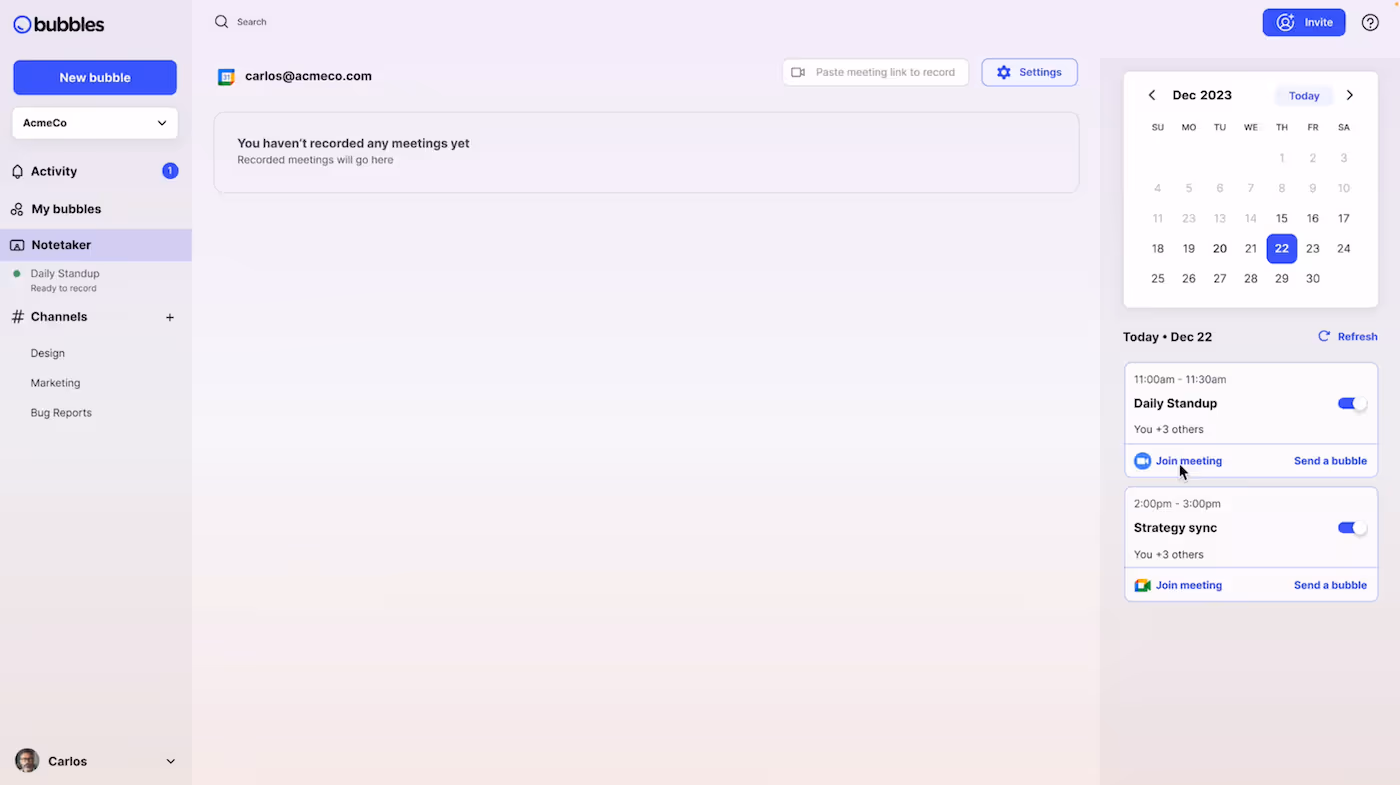 As you can see here on the right, Bubbles Notetaker is now ready to automatically join upcoming meetings on the chosen calendar. Here, the first meeting is a Daily Standup, and as you can also see, there is a toggle that allows you to disable the Notetaker from each specific meeting. You are also able to join your meeting directly through Bubbles by clicking 'Join meeting'.