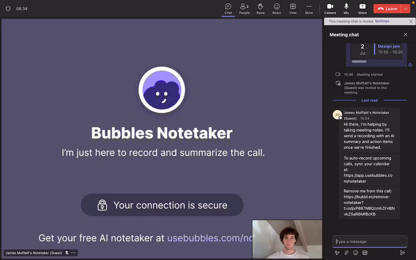 As you can see on the right, your Bubbles Notetaker will also let every attendee know who it is, and what it’s there to do.