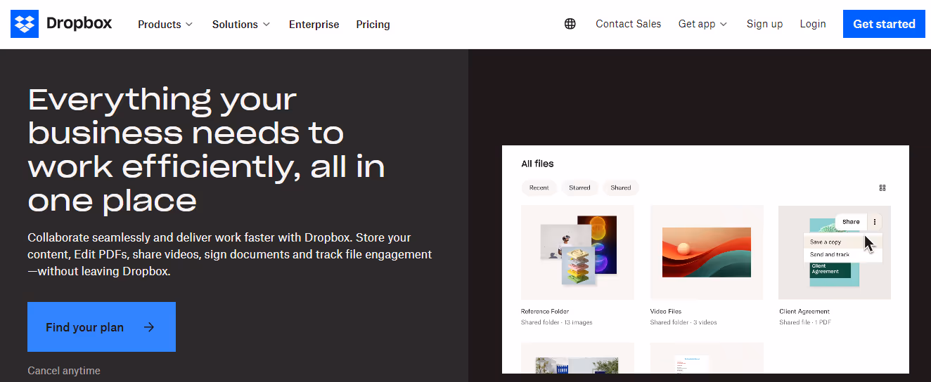 Dropbox’s business landing page shows minimalistic design principles. It has a clean and uncluttered layout and effectively communicates its value proposition.