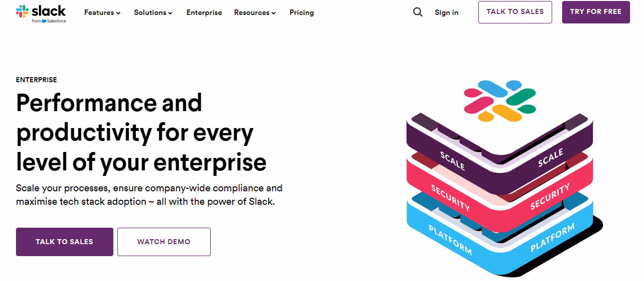 Slack’s Enterprise landing page showcases dynamic visuals and interactive elements to captivate users, transforming the lead generation process into an informative and enjoyable experience. The primary objective of the landing page is to introduce Slack’s messaging platform to potential customers and enable them to use Slack for team communication.