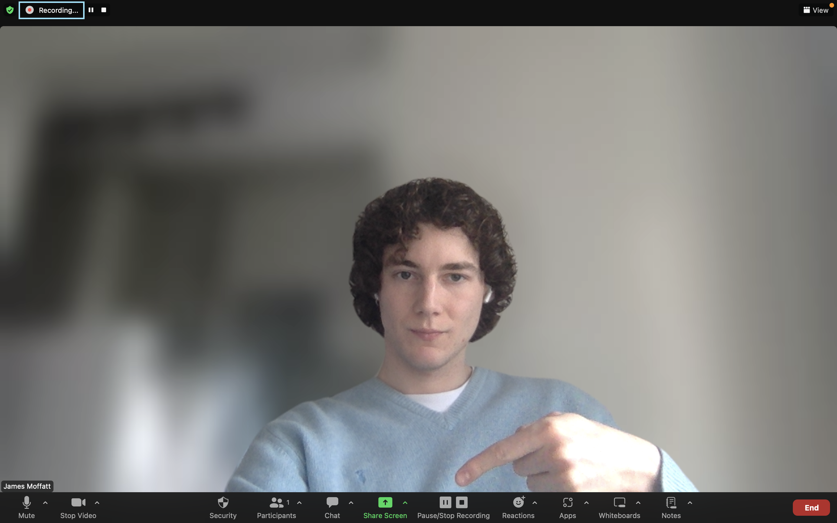 - Le logiciel d’enregistrement est maintenant en marche et, pour vous l’indiquer, l’écran de votre application Zoom apparaîtra comme je le montre ci-dessous. Vous avez la possibilité de suspendre temporairement ou d’arrêter complètement l’enregistrement de la réunion grâce aux icônes « Pause » et « Stop » dans le menu inférieur, que je pointe (littéralement) du doigt. Comme vous pouvez également le voir, une autre icône « Recording » apparaît désormais en haut à gauche pour indiquer que vous êtes en direct.