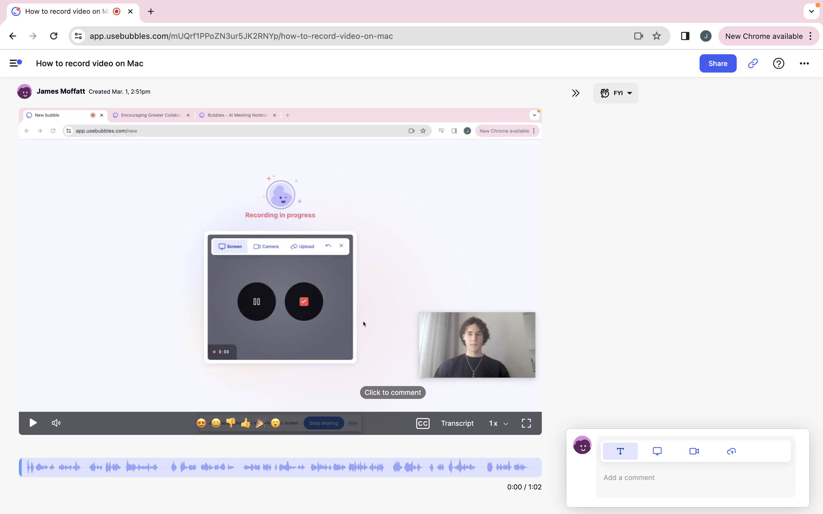 Pour celles et ceux d’entre vous qui ont choisi la première option, plus collaborative, de l’étape 5, Bubbles devient maintenant bien plus qu’un simple enregistreur vidéo pour Mac. Après avoir invité vos coéquipiers, nommé la bubble et choisi l’espace de travail auquel cette vidéo appartient, vous et les personnes invitées y aurez accès dans vos sections "My bubbles" respectives. Depuis cet endroit, vous pouvez revenir dans votre bubble vidéo pour consulter les commentaires ou retours laissés par vos collègues. C’est également la même vue que vous auriez si vous étiez dans le rôle de personne qui donne du feedback, et, comme vous pouvez le voir, il existe de nombreuses options pour poursuivre la conversation.
