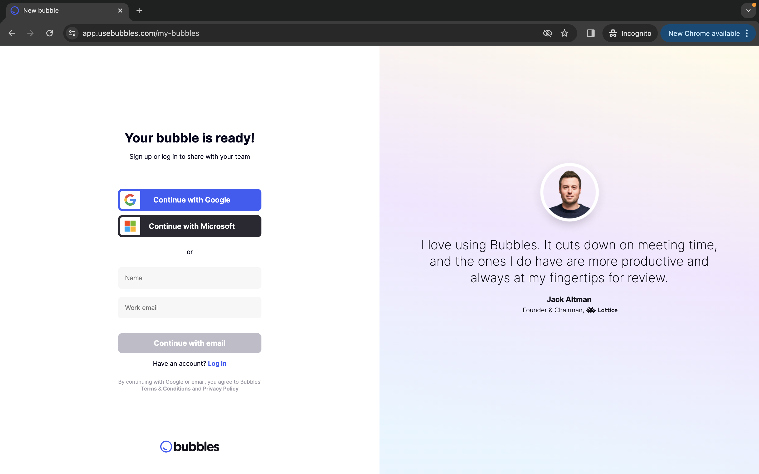 Une fois que vous mettez fin à l’enregistrement, vous êtes automatiquement redirigé vers cette étape. Comme mentionné plus tôt, Bubbles ne nécessite ni téléchargement ni installation, et pour obtenir votre enregistrement vidéo, il vous suffit de vous inscrire avec votre nom et votre adresse e‑mail professionnelle, ou simplement de continuer avec Google ou Microsoft pour donner instantanément un nouvel élan à votre vie collaborative.